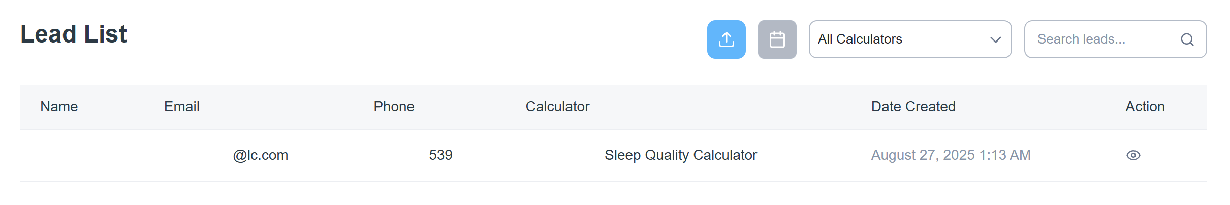The Lead List displays all the leads generated by your calculators. This section helps you review, filter, and manage individual leads captured through your website.
